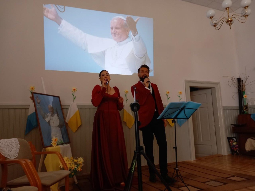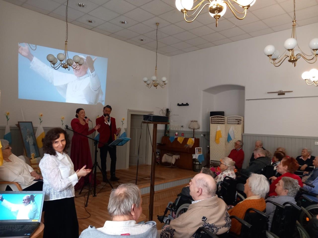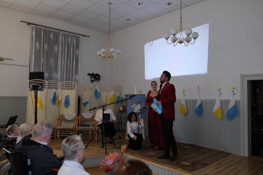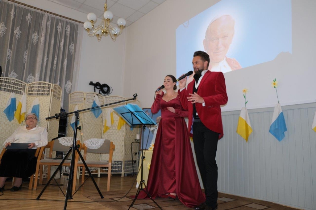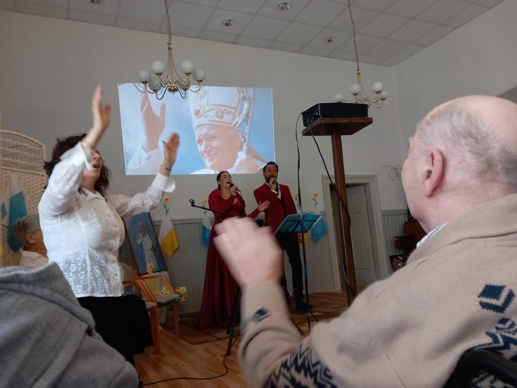 W kolejną rocznicę kanonizacji jak co roku odbyła się w naszym domu uroczystość. Uświetnili ją swoimi występami wspaniali goście. Byli to śpiewacy operowi – nasi wieloletni przyjaciele: Pani Monika Biederman-Pers oraz Jakub Oczkowski, którzy w mistrzowski sposób wykonali takie pieśni jak „Czarna Madonna”, „Ty tylko mnie poprowadź”, „Abba Ojcze”, „Barka” i inne. Na spotkaniu ku czci „Naszego Papieża” nie mogło zabraknąć akcentów góralskich. Te zapewnił nam występ, również od lat zaprzyjaźnionego z naszymi mieszkańcami, Zespołu góralskiego ‘Skalni”. Pomiędzy wykonaniami artystów mieszkanka naszego domu Pani Ewa Zastawniak - Birkenmajer zaprezentowała cytaty z takich dzieł jak "Kwiatki Błogosławionego Jana Pawła II", "O przebaczaniu Jan Paweł II - Myśli na nowe tysiąclecie”.