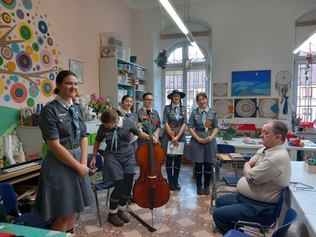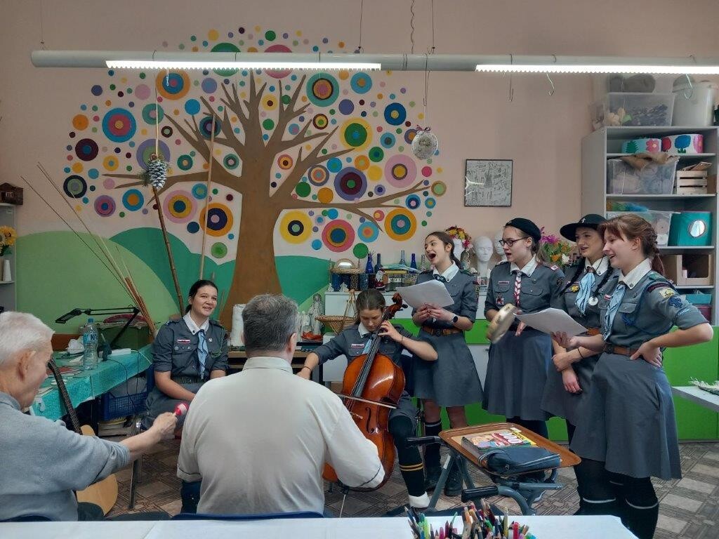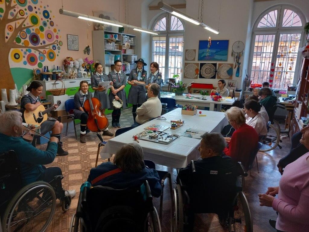 Tym razem za sprawą harcerek z 18 Drużyny Harcerek Wędrowniczek „Połabianie”, które w dniu 30 grudnia 2024 roku odwiedziły naszych seniorów w trakcie zajęć z pracowni artystycznej. Spotkanie było okazją do wspólnego zaśpiewania przy pięknych dźwiękach wiolonczeli wielu kolęd oraz wysłuchania kilku harcerskich piosenek.