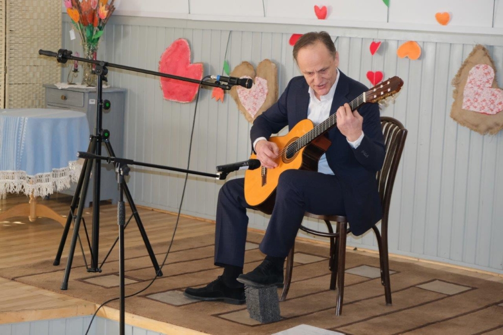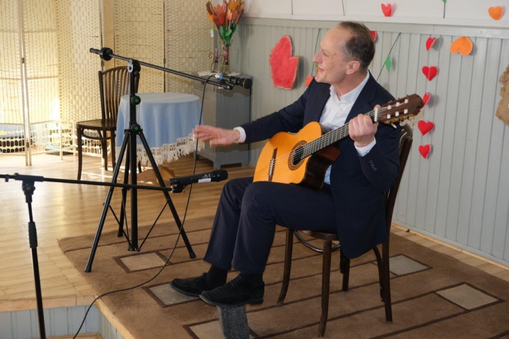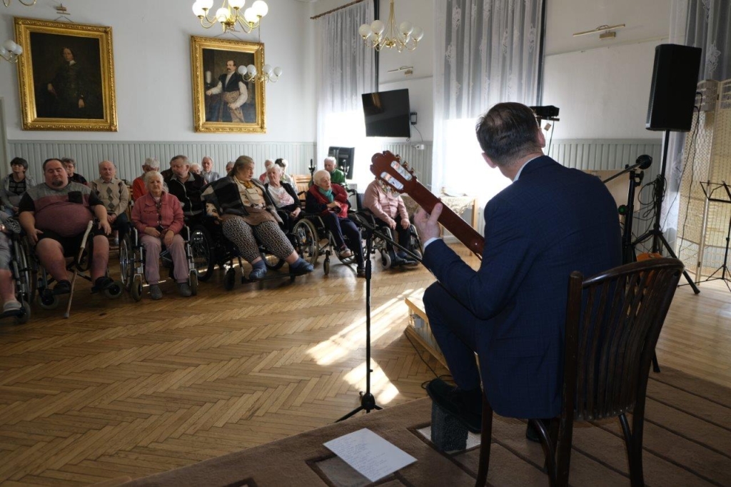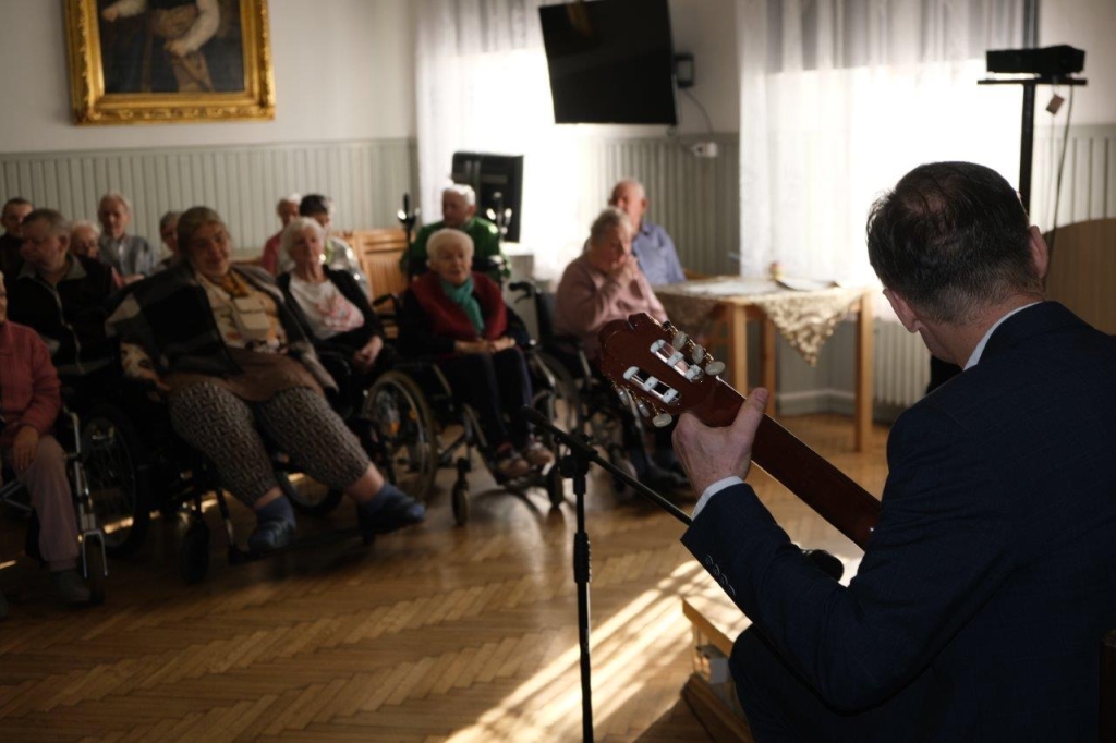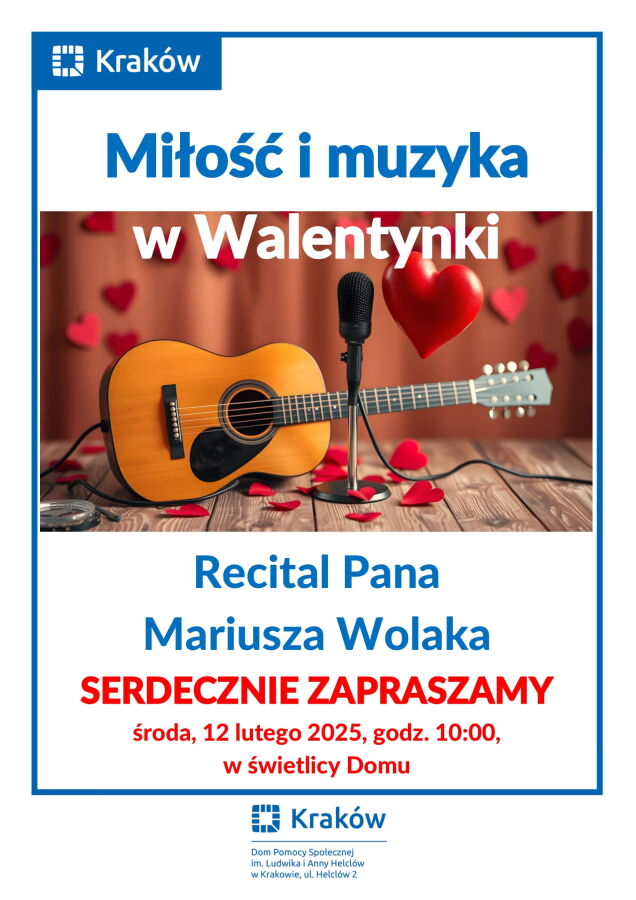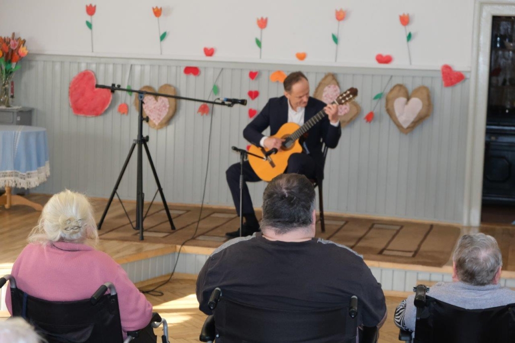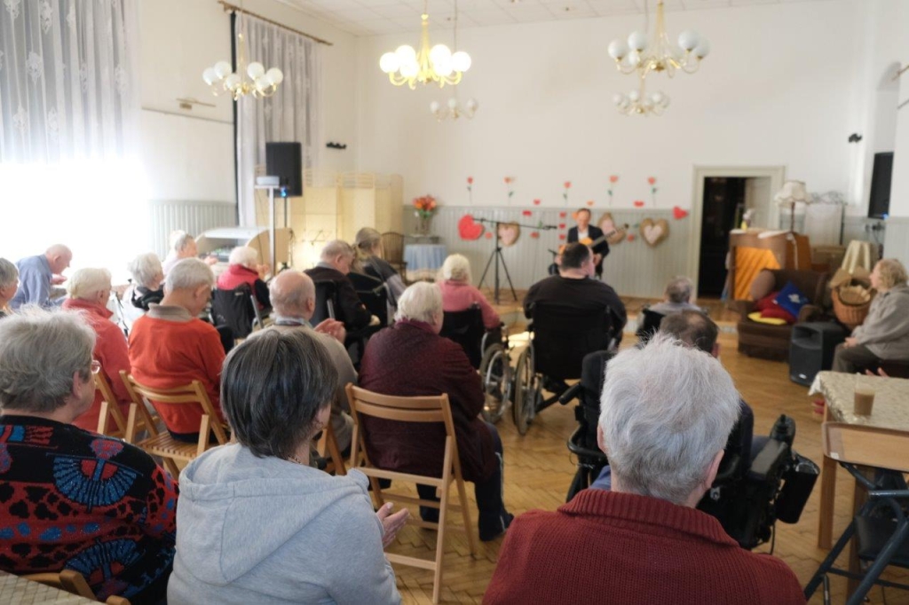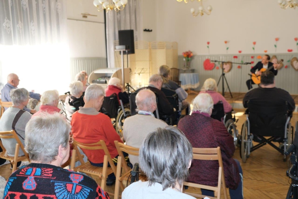 Z okazji Walentynek, w dniu 12 lutego 2025 roku, Pan Mariusz Wolak odwiedził naszych mieszkańców z gitara i garścią piosenek. Na występ składały się utwory różnych wykonawców, w bardzo różnorodnych klimatach, począwszy od przebojów zespołów: Czerwone Gitary, czy The Beatles, poprzez polskie piosenki biesiadne a na religijnych („Barka”) kończąc. Przy wielu wykonaniach nasi seniorzy, zachęceni przez pana Mariusza, śpiewali razem z nim. Było to bardzo sympatyczne środowe przedpołudnie.