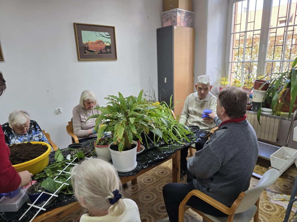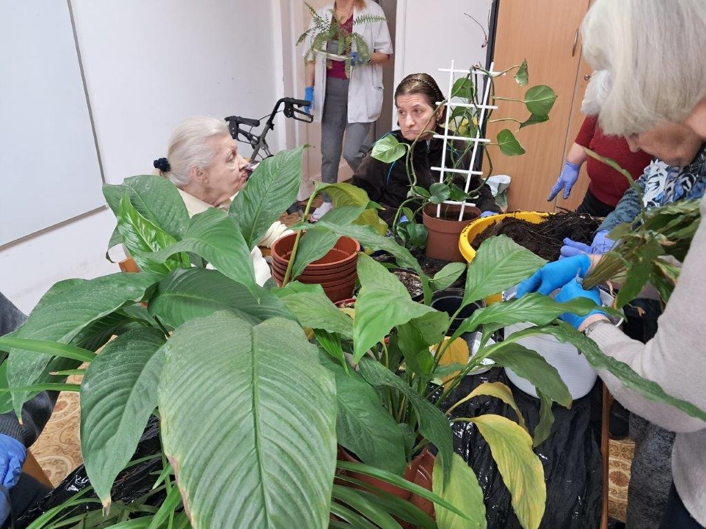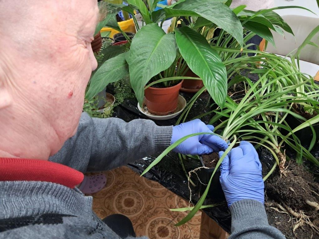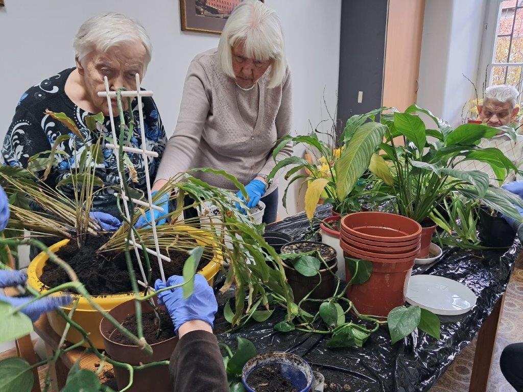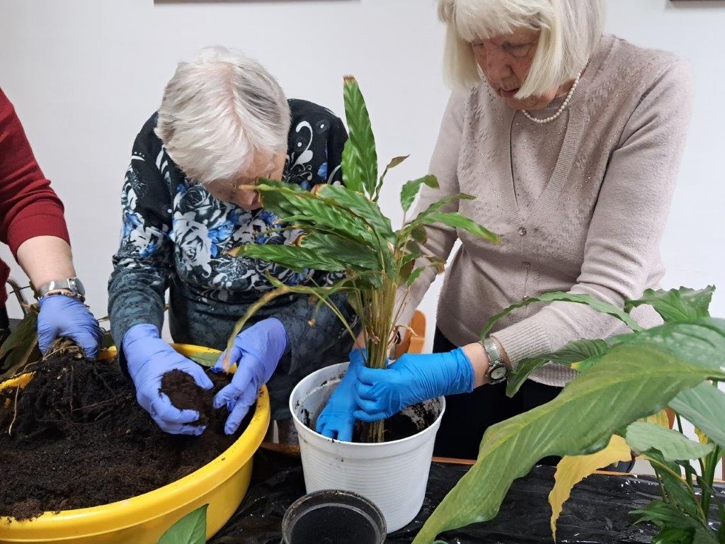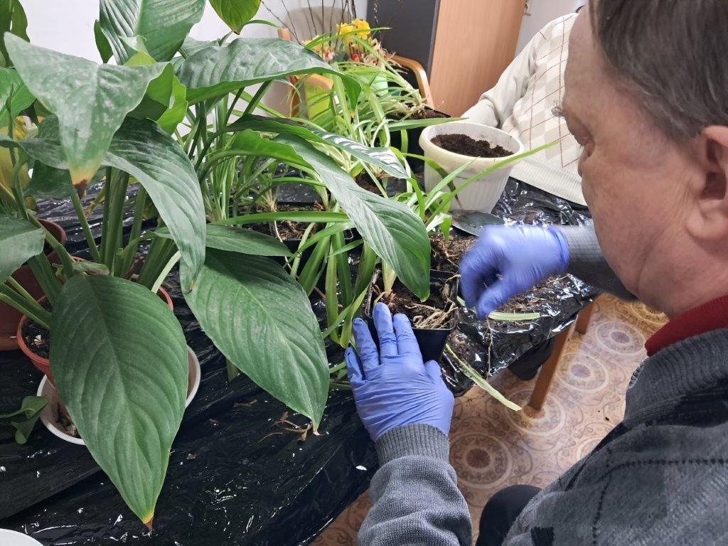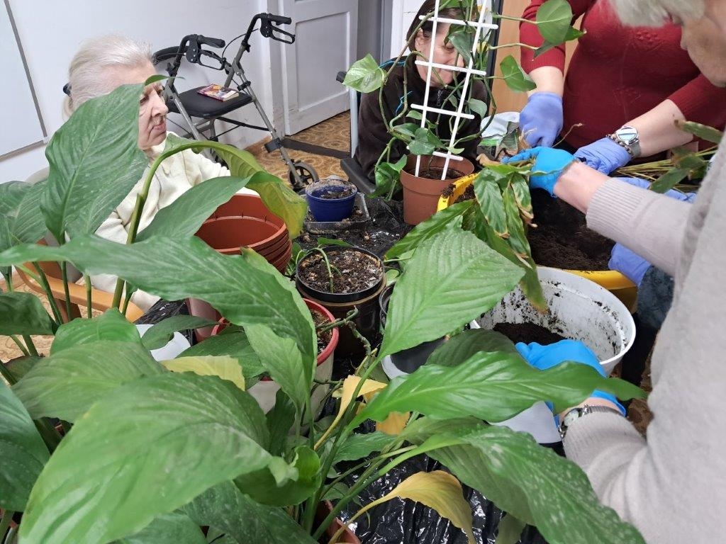 Nadszedł czas na wiosenne działania w ramach hortiterapii. W pierwszej kolejności grupa naszych ogrodników zajęła się roślinami doniczkowymi, które przez całą zimę upiększały pokoje mieszkańców i części wspólne Domu.