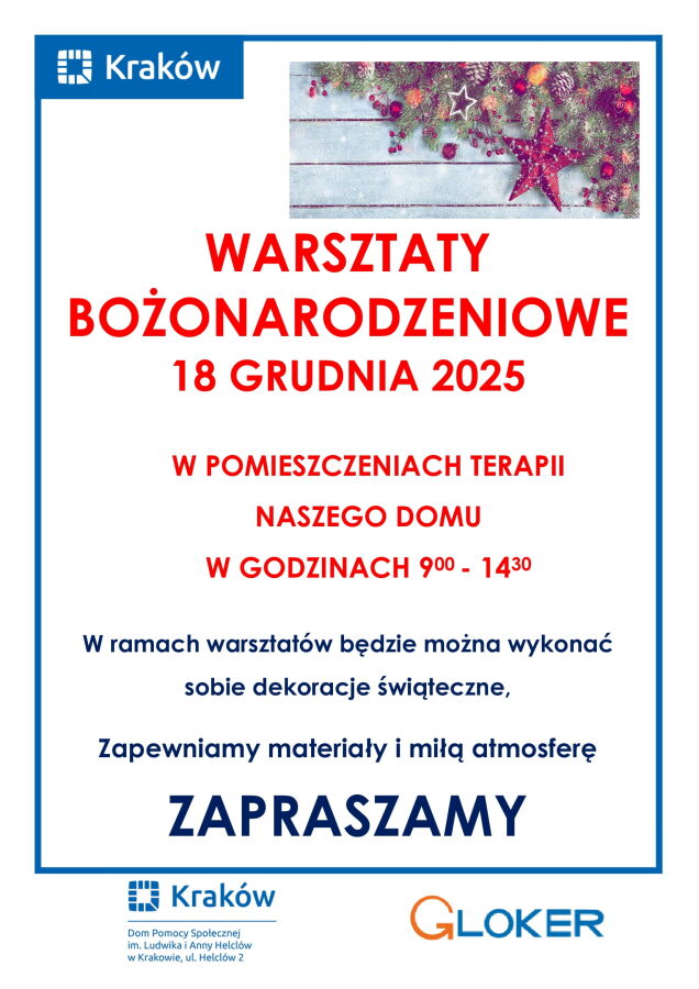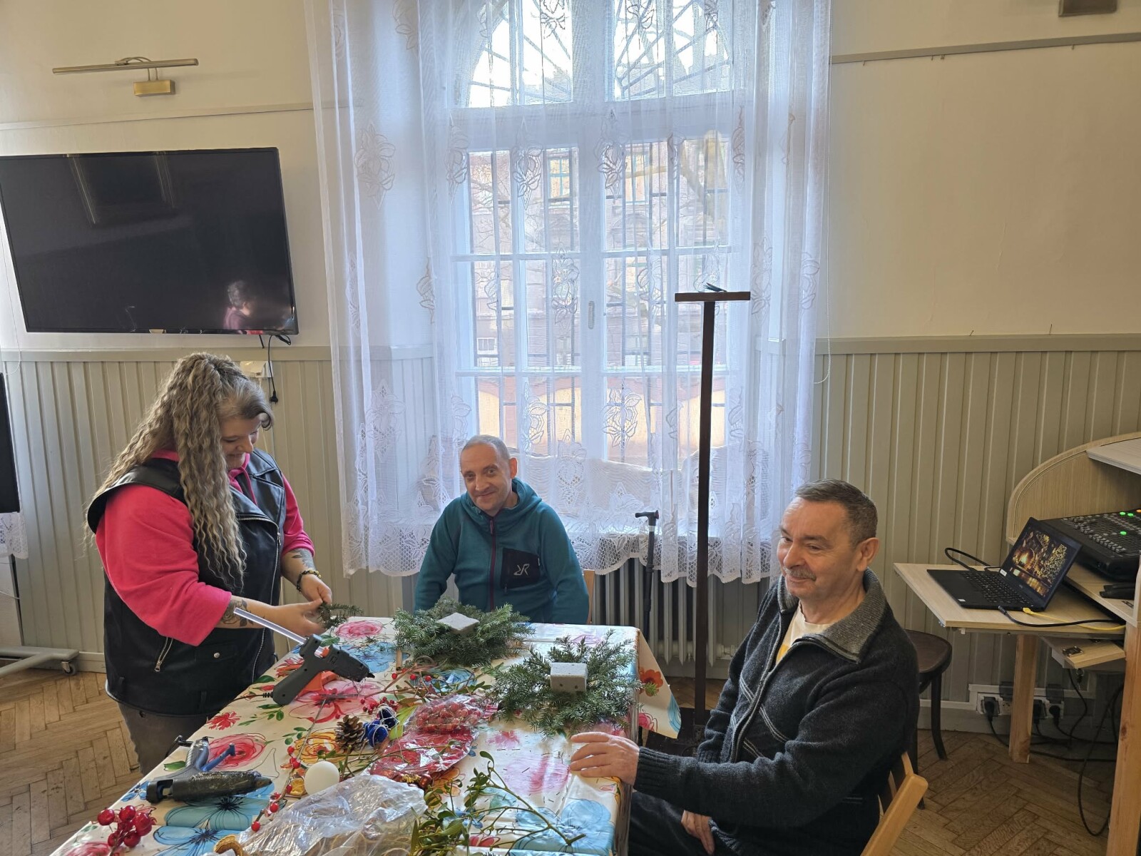 W dniu 18 grudnia 2025 roku, w godzinach 9:00–14:30, w pomieszczeniach terapii naszego domu odbyły się warsztaty bożonarodzeniowe. Wydarzenie zostało zorganizowane we współpracy z Policealną Szkołą Gloker z Krakowa i cieszyło się dużym zainteresowaniem uczestników.