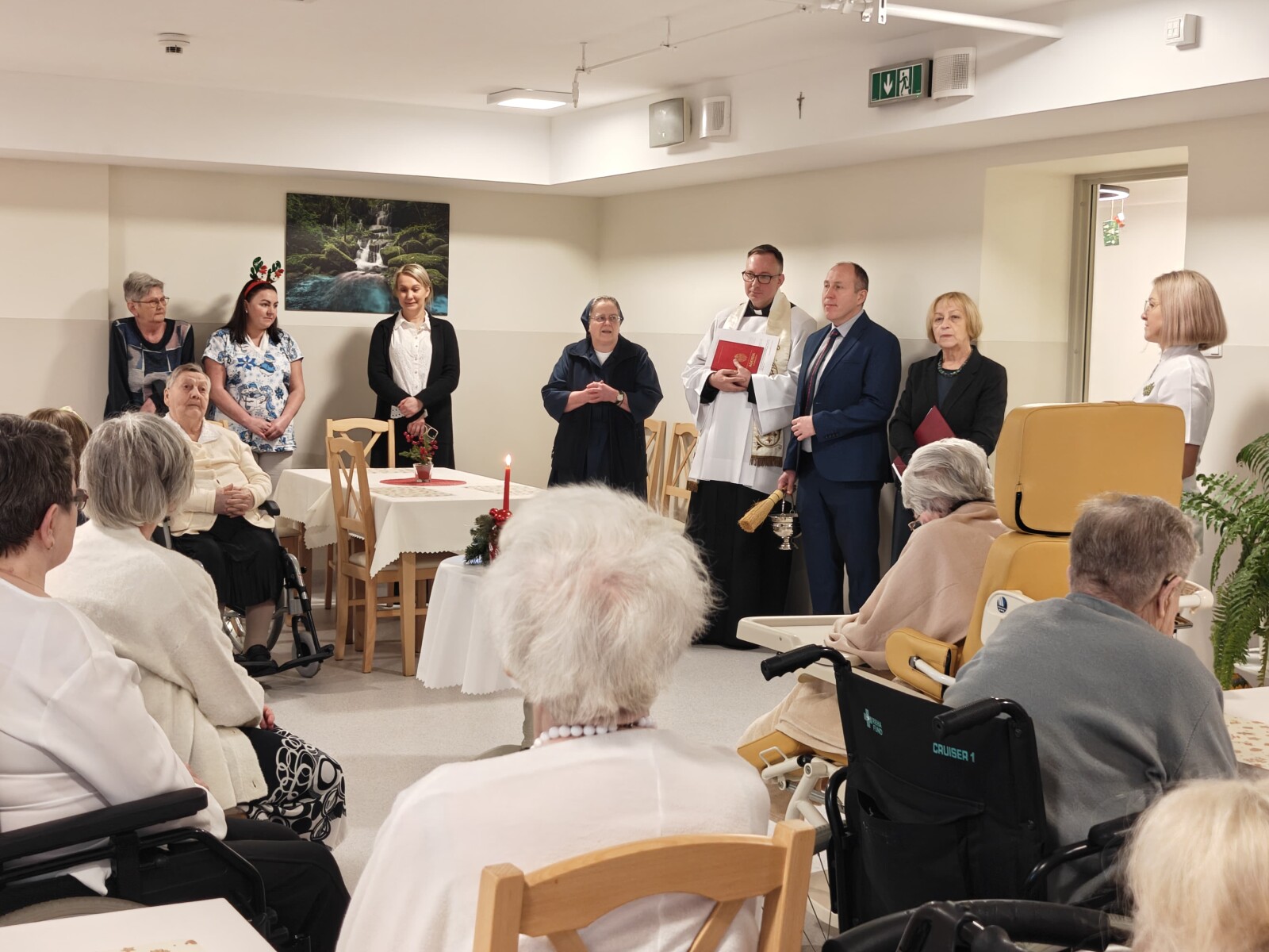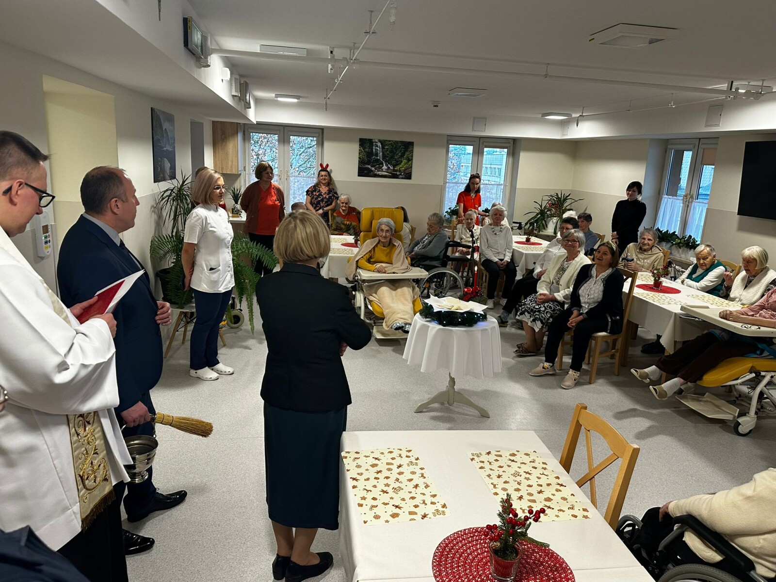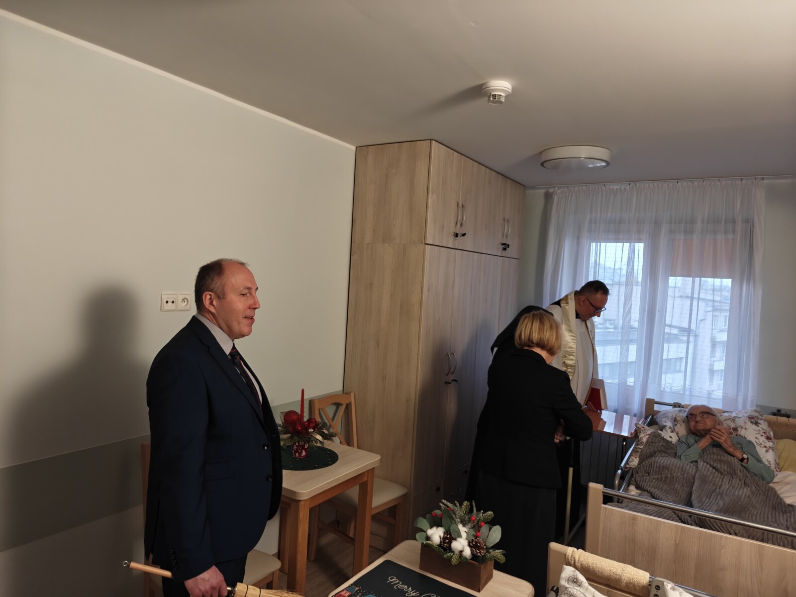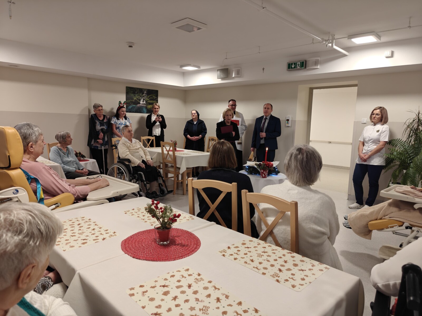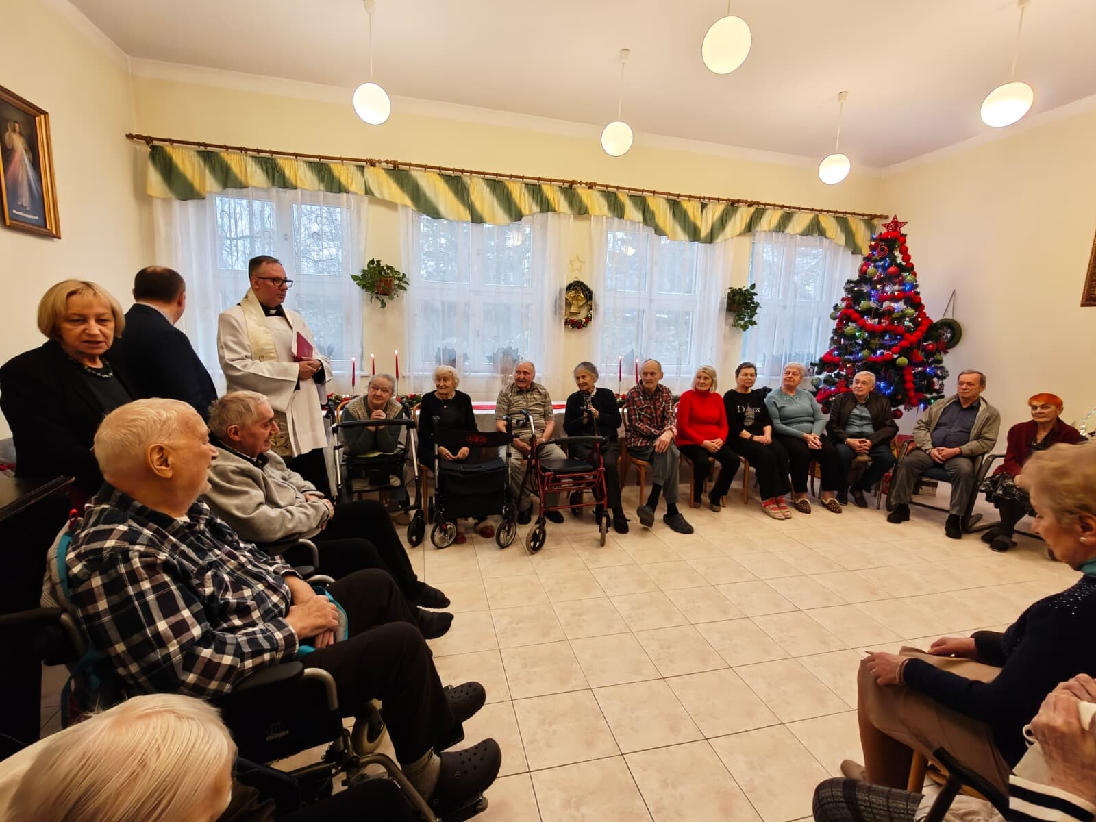 W poniedziałkowe przedpołudnie, 22 grudnia, na dwa dni przed Wigilią Świąt Bożego Narodzenia, dyrektor Domu – Pani Józefa Grodecka oraz zastępca dyrektora - Pan Marcin Ogórek, wraz ze współpracownikami i kapelanem odwiedzili mieszkańców wszystkich Zespołów Pielęgnacyjno - Opiekuńczych.