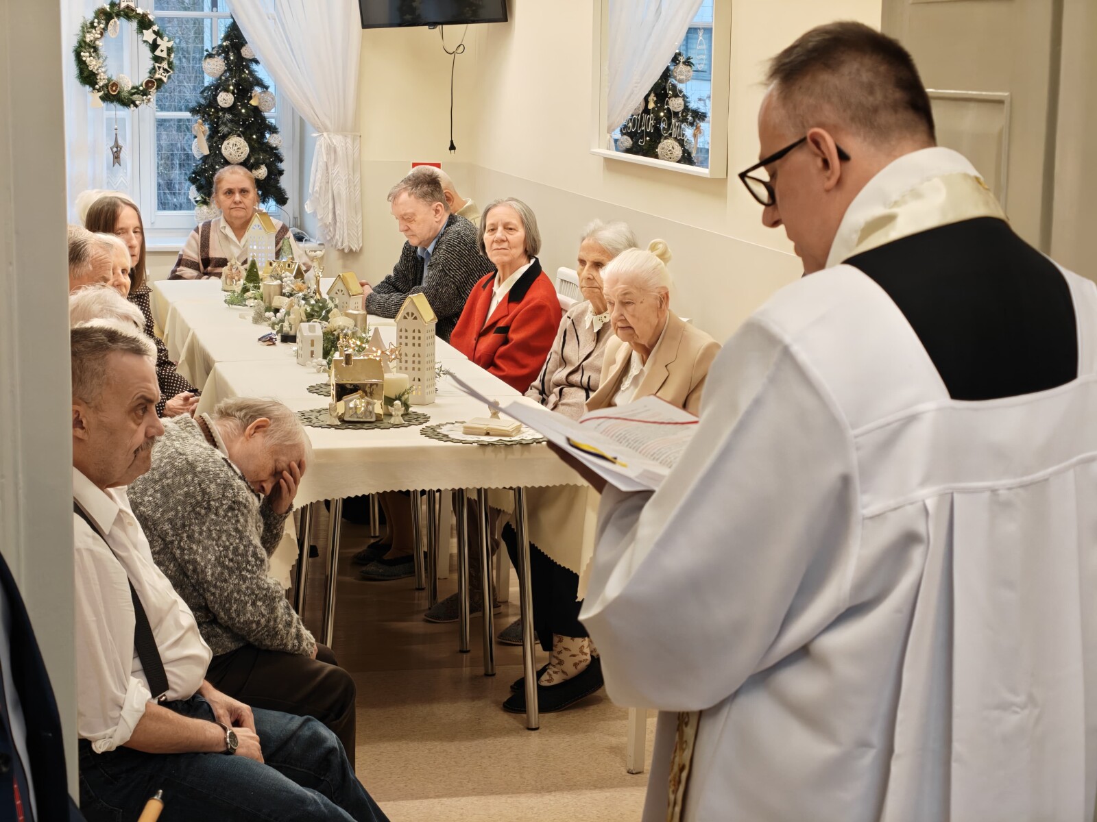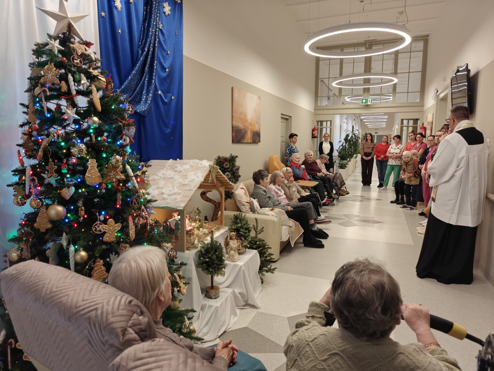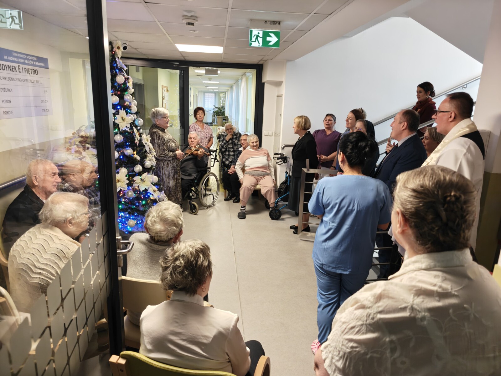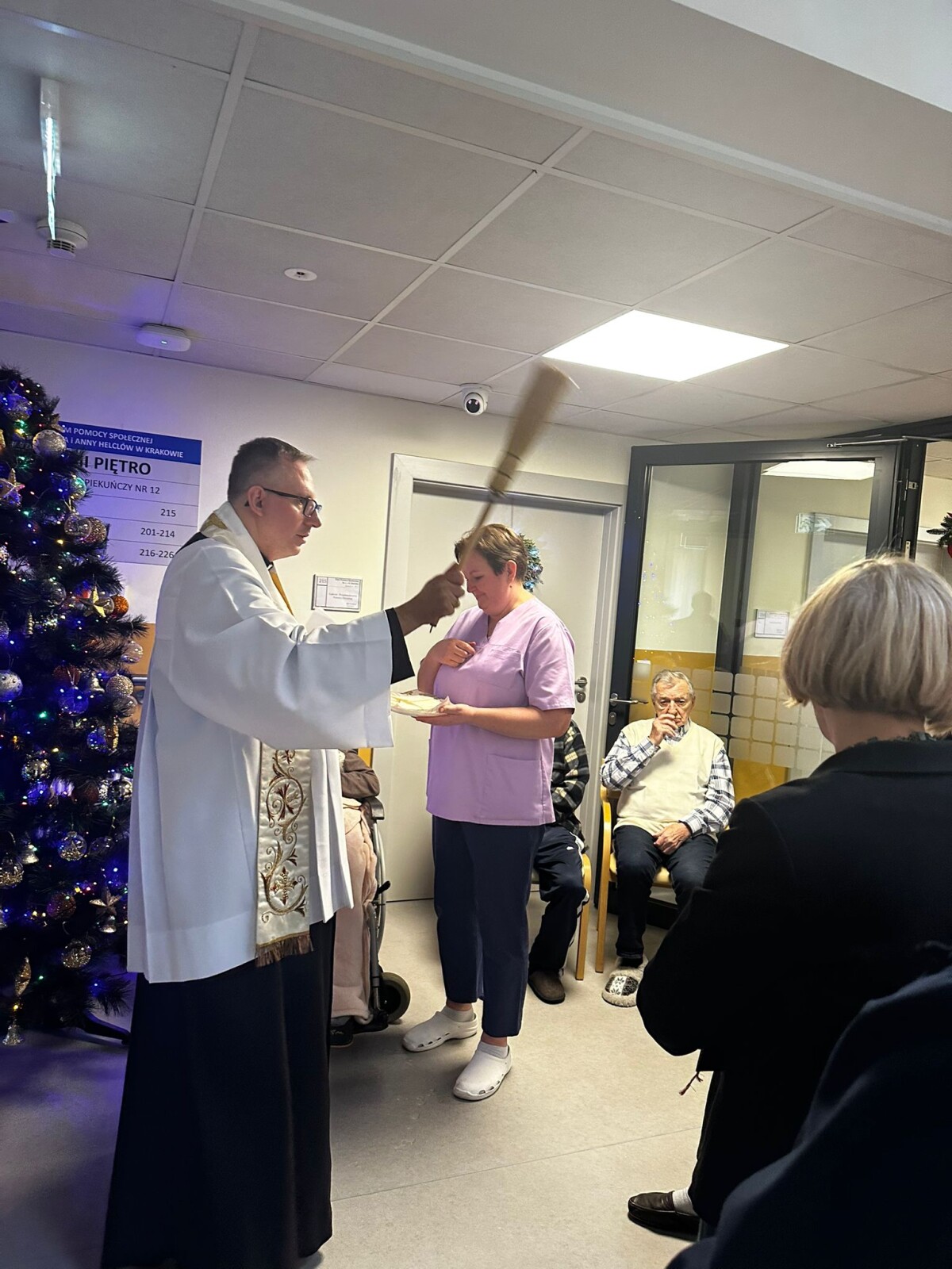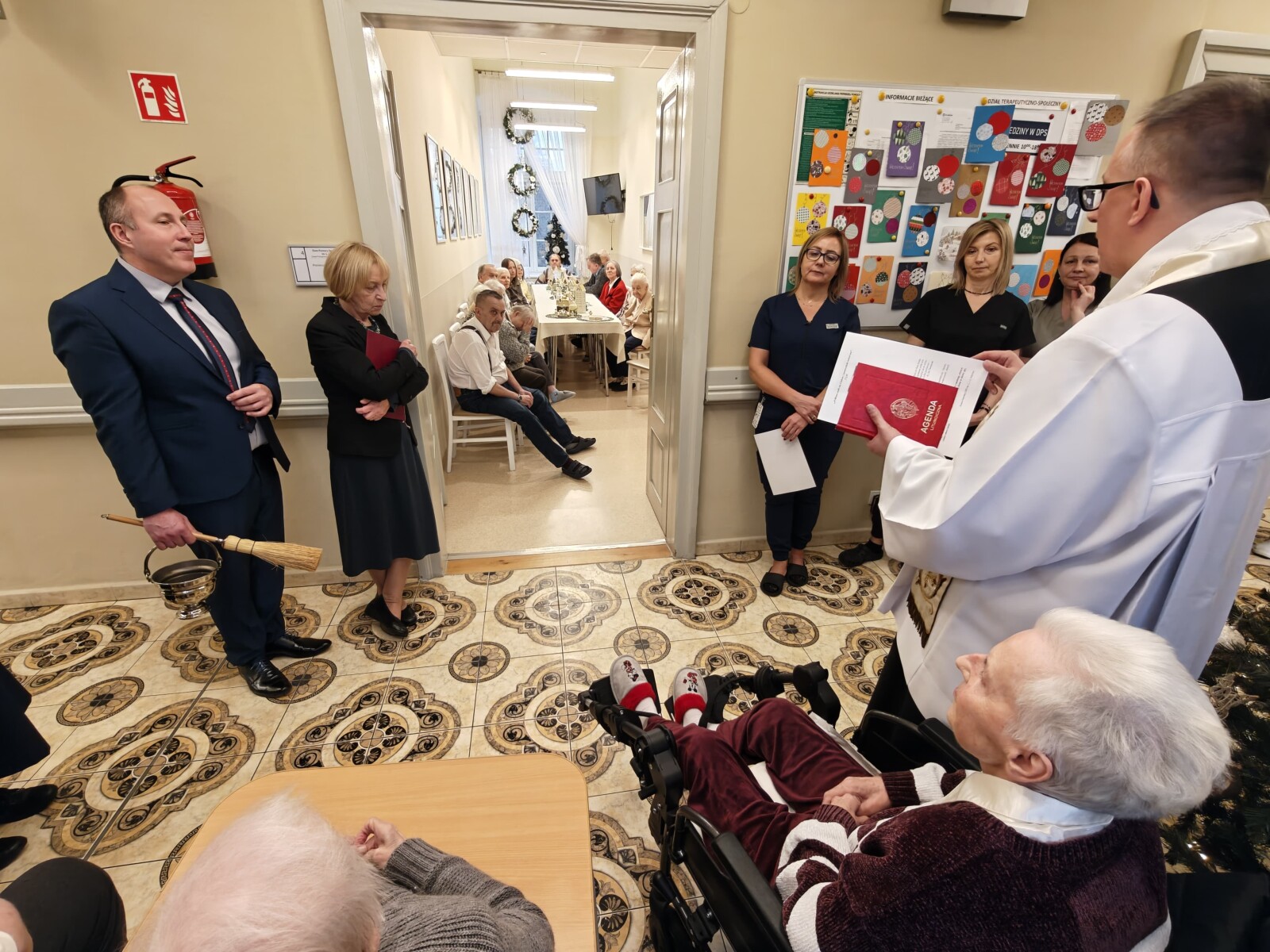 W poniedziałkowe przedpołudnie, 22 grudnia, na dwa dni przed Wigilią Świąt Bożego Narodzenia, dyrektor Domu – Pani Józefa Grodecka oraz zastępca dyrektora - Pan Marcin Ogórek, wraz ze współpracownikami i kapelanem odwiedzili mieszkańców wszystkich Zespołów Pielęgnacyjno - Opiekuńczych.