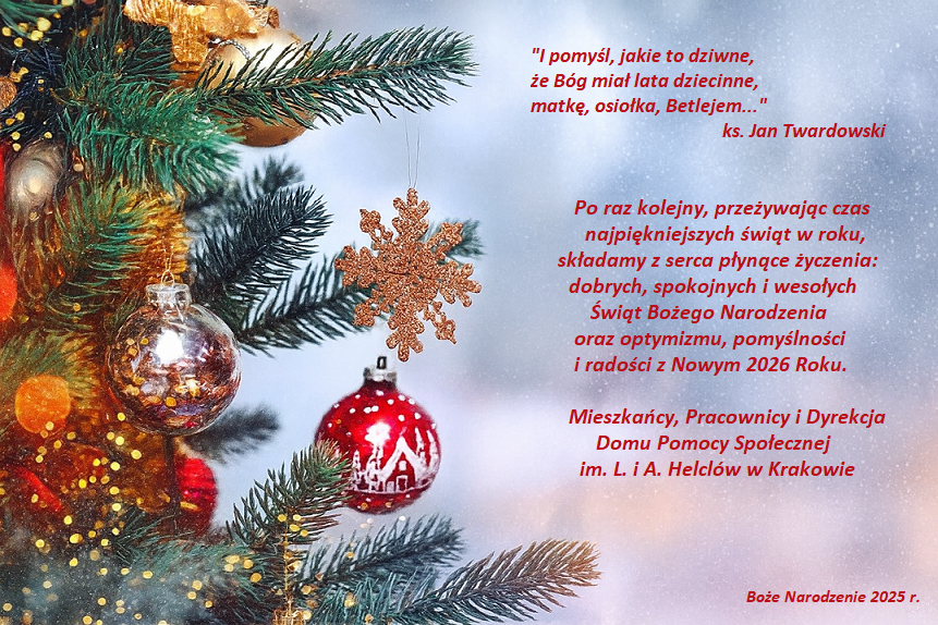 Spotkania odbywały się w przepięknie przystrojonych wnętrzach Domu. Atmosfera była iście świąteczna, co w dużej mierze było zasługą pracowników Zespołów, którzy z ogromnym zaangażowaniem i pomysłowością przygotowali odświętne dekoracje, prezentowane w poniższej fotogalerii. Na zakończenie każdego ze spotkań wszystkim mieszkańcom oraz pracownikom Domu przekazano serdeczne życzenia zdrowia, spokoju i nadziei płynącej ze zbliżających się Świąt. By nadchodzące Święta Bożego Narodzenia przyniosły wiele ciepła, radości, bliskości drugiego człowieka oraz poczucie bezpieczeństwa, a Nowy Rok 2026 obdarzył wszystkich siłą, pogodą ducha i spełnieniem najskrytszych marzeń.